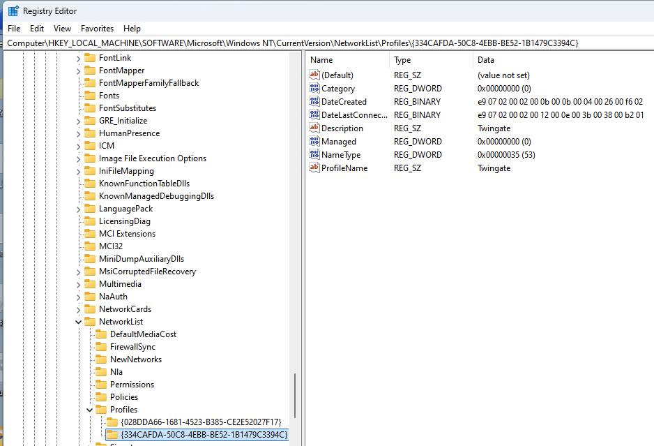 HKEY_LOCAL_MACHINE\SOFTWARE\Microsoft\Windows NT\CurrentVersion\NetworkList\Profiles - Click into each GUID value to identify GUID keys that contain entries of Twingate with the